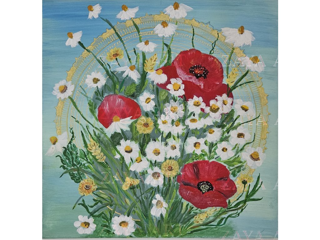 Táto maľba je oslavou života, prírody a radosti z prítomného okamihu. Kytica plná červených makov, margarét a lúčnych kvetov v objatí zlatého kruhu pripomína slnečnú mandalu – symbol dokonalosti, cyklu života a spojenia so svetlom.